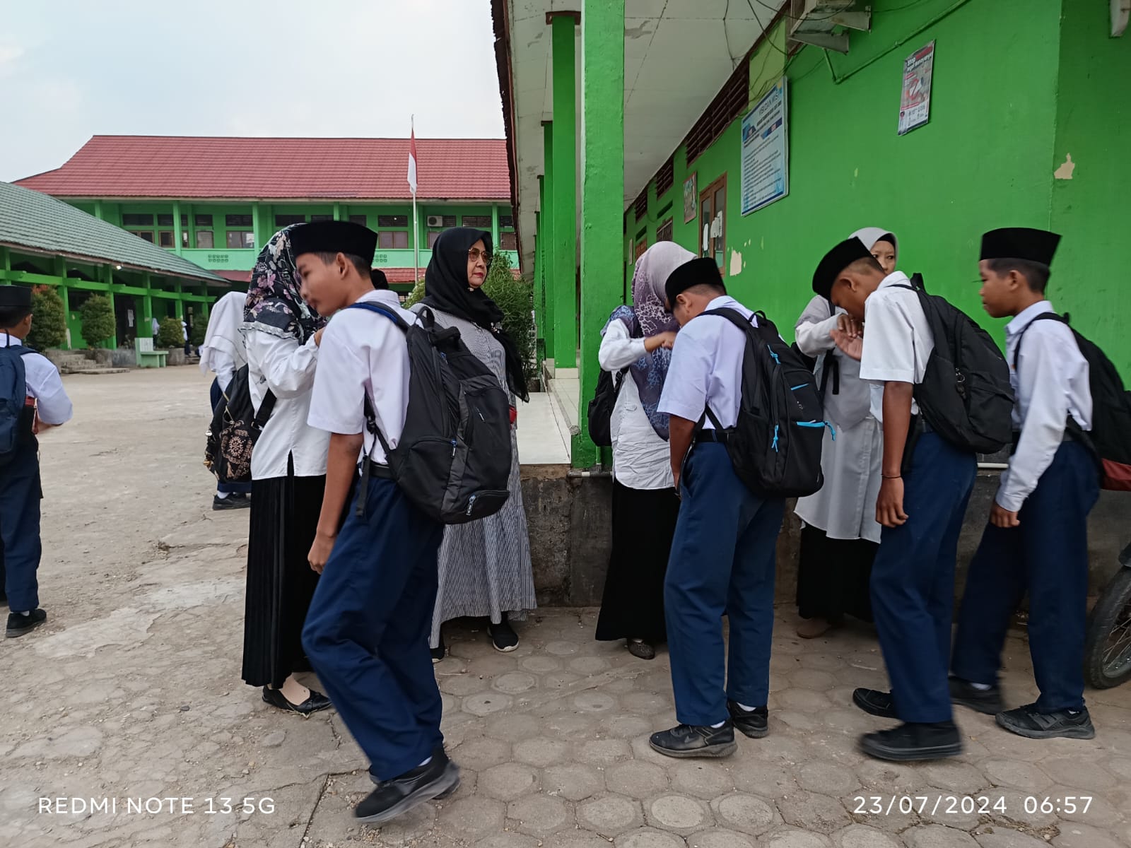 MTsN 1 Kota Jambi -- Untuk menanamkan pendidikan karakter dan nilai-nilai kehidupan pada siswa, dapat dilaksanakan di manapun dan kapanpun baik di kelas atau di luar kelas. Salah satu kegiatan yang dilaksanakan di MTs N 1 Kota Jambi dalam menanamkan pendidikan karakter dan nilai kehidupan pada siswa adalah penyambutan siswa pada pagi hari.