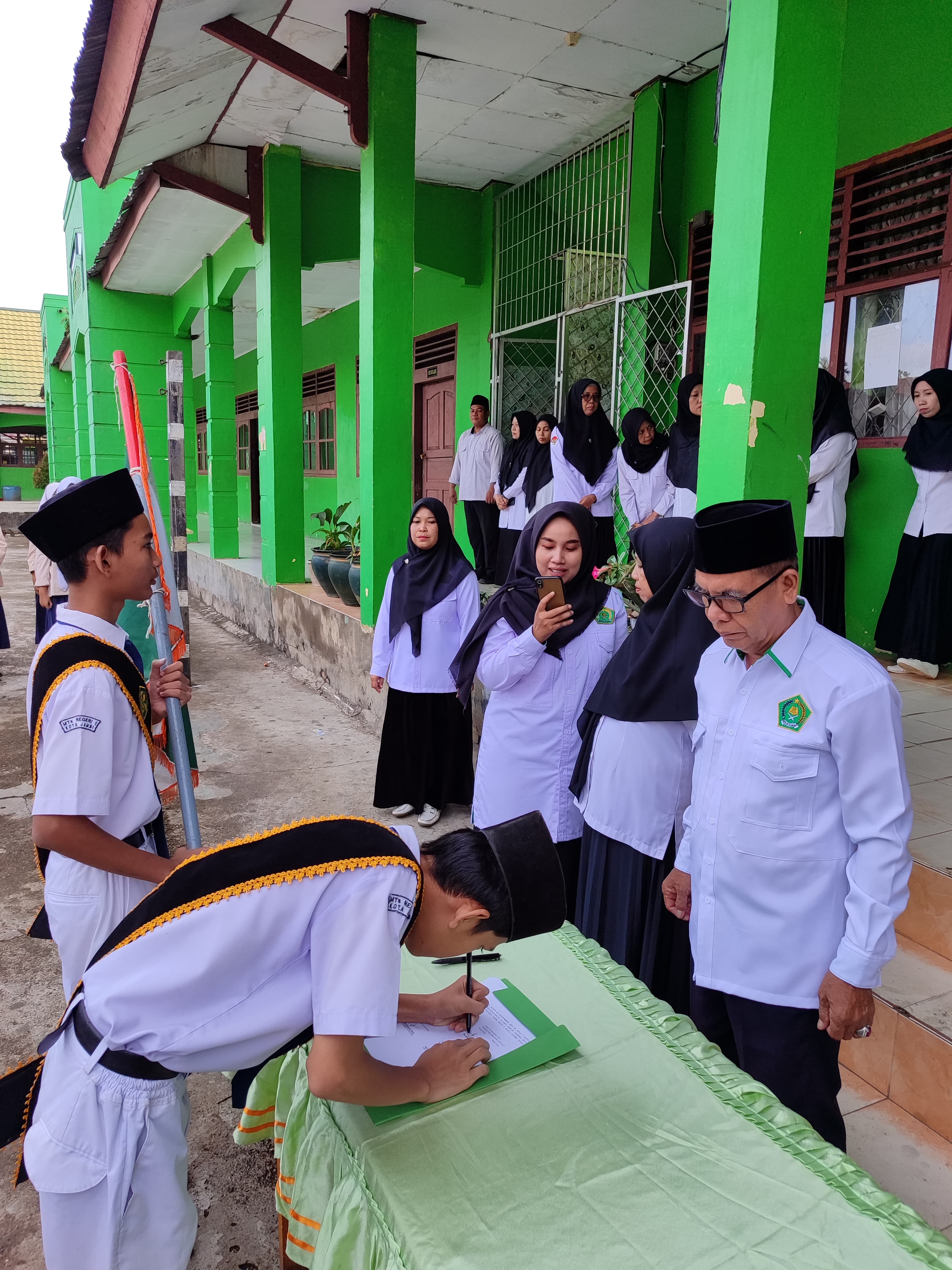 Pasukan OSIM periode 2023-2024 melangkah tegap menuju tempat kepala madrasah berdiri, dilanjutkan pasukan OSIM baru melangkah mengikuti. Setelah kedua pasukan tersebut berhenti di depan, penyerahan bendera OSIM dilakukan dari ketua OSIM lama, Andila Melandi kepada kepala madrasah untuk kemudian diserahkan kepada ketua OSIM baru Syahidan Setelah prosesi penyerahan bendera tersebut, pasukan OSIM periode 2023-2024 meninggalkan lapangan. Acara dilanjutkan dengan penandatangan berita acara dan pengucapan janji dan ikrar OSIM periode 2024-2025. Suasana terlihat hening ketika prosesi ini dilakukan.