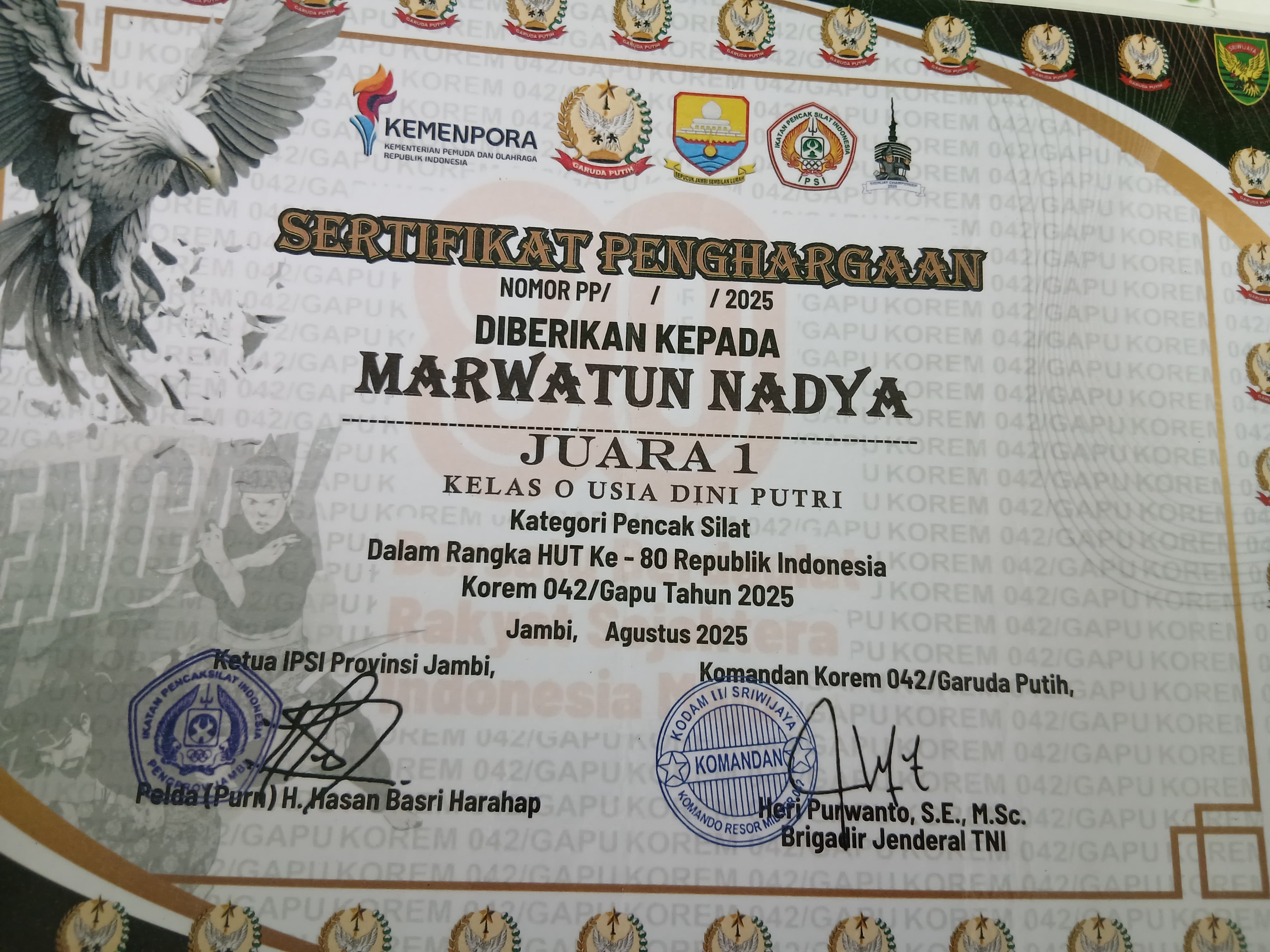 Jambi, 10 Agustus 2025 — Prestasi membanggakan kembali diraih oleh siswa MTs Negeri 1 Kota Jambi. Marwatun Nadya, salah satu siswi berbakat di sekolah tersebut, berhasil meraih juara dalam lomba pencak silat yang diselenggarakan oleh Korem 042/Gapu dalam rangka memperingati Hari Ulang Tahun ke-80 Republik Indonesia.